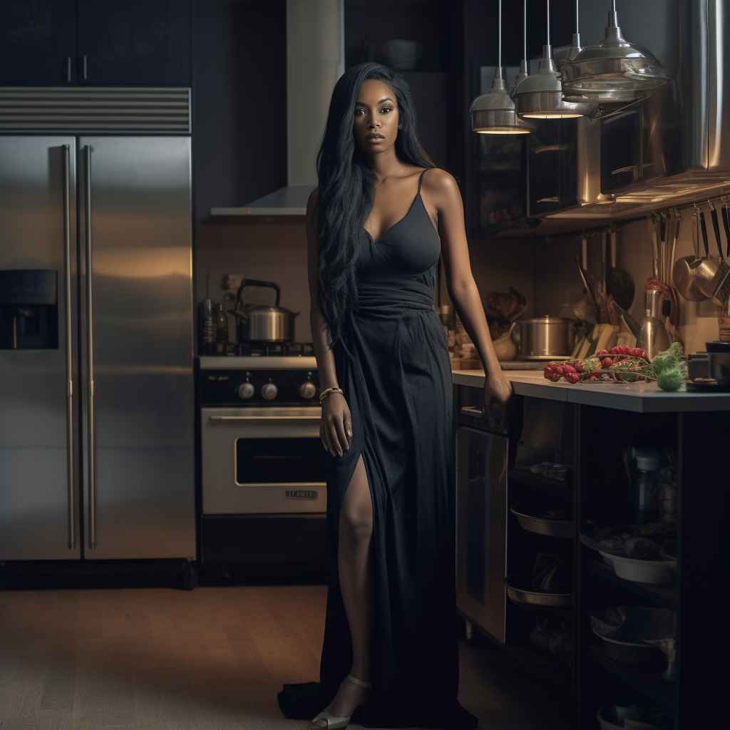 Beautiful woman in Dior outfit with diamond chain and ninja sword, surrounded by art, and "Kenyatta" written in the background